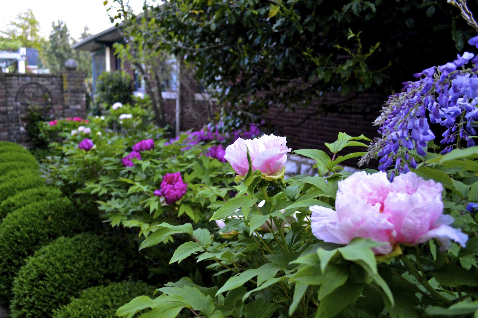 | wisteria, tree peonies in bg |